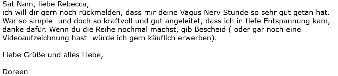 Ich möchte Dir rückmelden, dass mir deine Yogastunden sehr gut tun, und ich sehr dankbar bin für die Aufzeichnungen! Obwohl ich schon lange Kundalini Yoga praktiziere und auch selber Kurse gebe, kannte ich einige Übungen noch nicht. Der Vagus Nerv war in unserer Ausbildung leider überhaupt kein Thema. Ich bin Dir auch sehr dankbar für Deine theoretischen Ausführungen, das ist sehr hilfreich für mich! Ich war in den letzten Wochen aufgrund von Stress in so extremer Anspannung und Erschöpfung, dass die "klassischen" Kundalini Yoga Übungen nicht mehr so richtig gewirkt haben. Die Vagus Übungen, vor allem diejenigen, die Du zu Anfang der Stunde machst, sind genial, sie sind genau das was ich gerade brauche, um mich wieder zu regulieren. Danke für diese wertvollen tools!